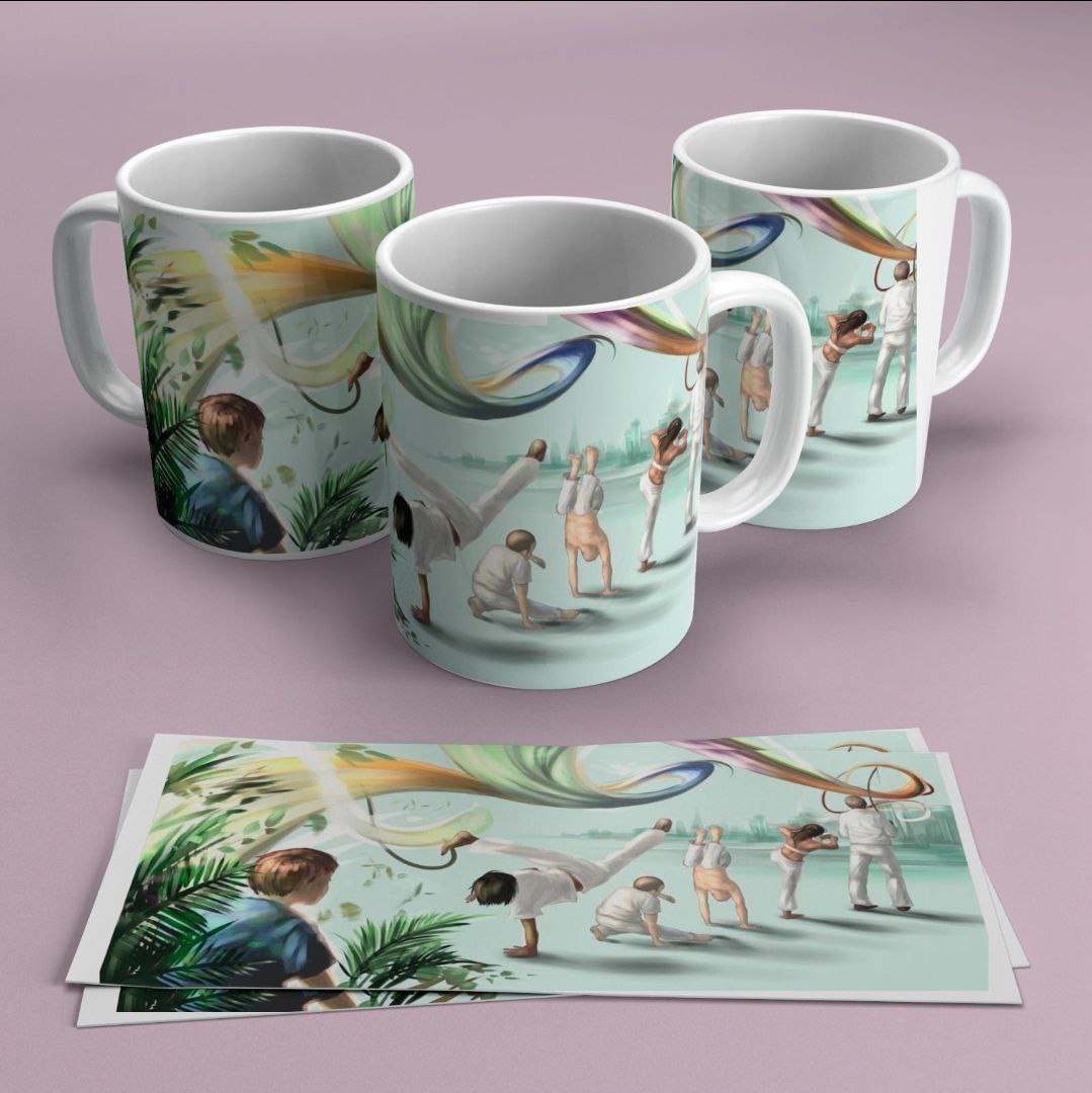 Tauchen Sie ein in die fließende Welt der Capoeira. Diese wunderschön gestaltete Keramiktasse zeigt ein panoramaartiges Kunstwerk, das die Entwicklung, das Training und die Gemeinschaft der Capoeira in sanften, lebendigen Farben einfängt.